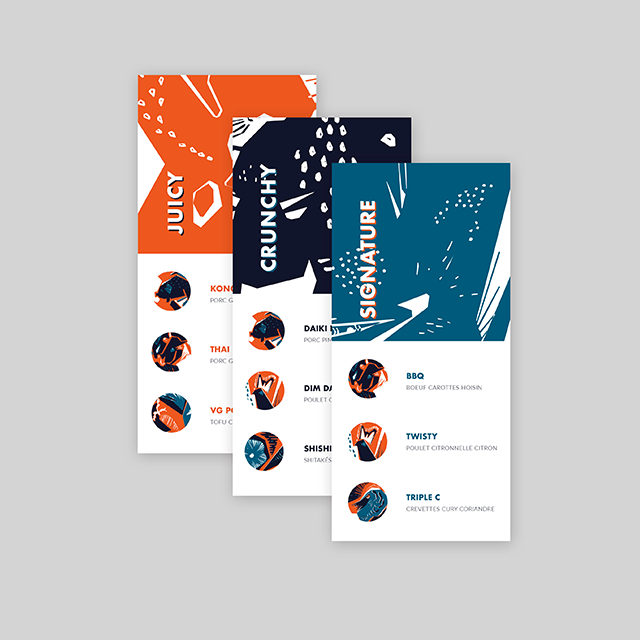 Pour son resto, fast casual bruxellois, le concept graphique se déploie autour d’un tableau. Une illustration réalisée sur-mesure, véritable pêle-mêle malicieux et gourmand construit sur l’imaginaire de ces fameuses bouchées. Une explosion de saveurs qui mêle de nombreux ingrédients : boeuf, porc, poulet, crevette, shitaké, carottes, edamame, aromates ; par pincée, émincés, à la vapeur, croquants, ou juteux…