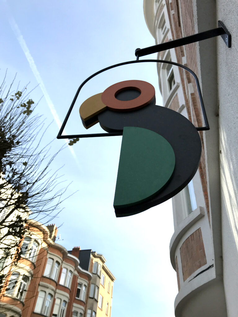 Le logo illustre ce drôle d’oiseaux souligné par une typographie aux lignes franches en clin d’oeil à l‘im- meuble Art-déco dans lequel est installé le bistrot.